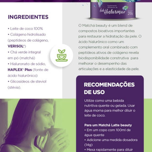 Combinamos as propriedades únicas do Ácido Hialurônico HAPLEX PLUS e dos Peptídeos Bioativos de Colágeno VERISOL que revelam biodisponibilidade construtiva, com o aroma suave e a energia do mais puro Matchá (Camellia Sinensis) e as gorduras boas do Leite de Coco 100%.